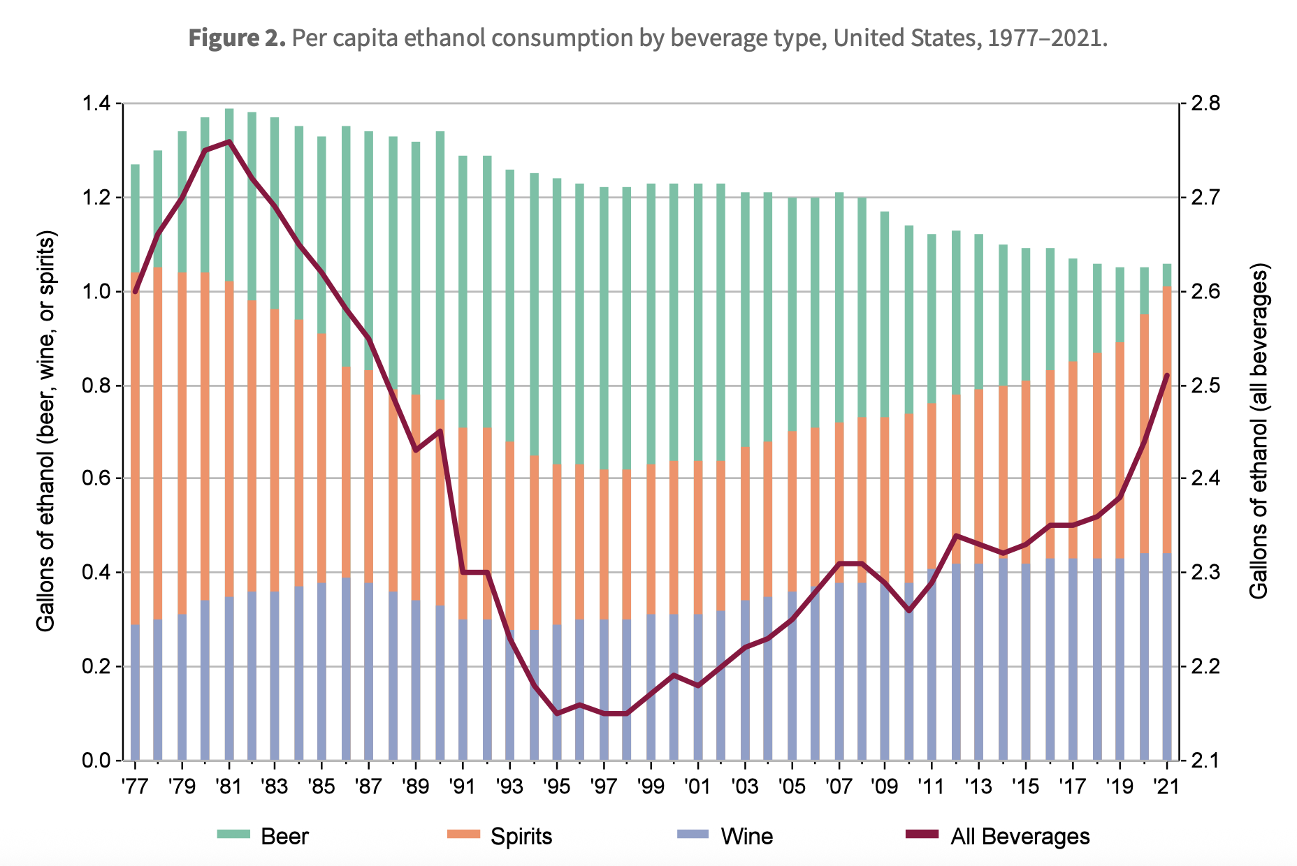 Things may be bad for alcohol, and the hype surrounding non-alcoholic alternatives remains deafening. Yet when we look at consumers’ revealed preferences—what they do, rather than what they say—we don’t see anything like this kind of collapse. If just a large percentage of Americans had just stopped drinking, we’d see it in sales figures. And, while sales are down, they don’t reflect the freefall measured in Gallup’s poll numbers.