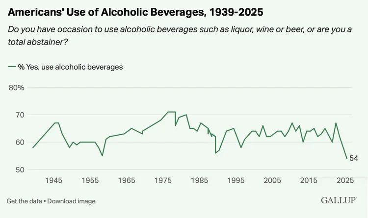 “The percentage of U.S. adults who say they consume alcohol has fallen to 54%, the lowest by one percentage point in Gallup’s nearly 90-year trend. This coincides with a growing belief among Americans that moderate alcohol consumption is bad for one’s health, now the majority view for the first time.”