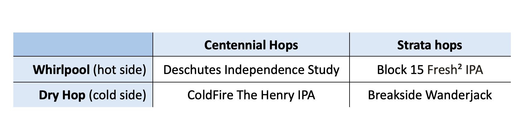 However, because other variables may affect the way fresh hops express themselves, each brewery has made a slightly different couplet of beers. Two breweries are using Centennial hops, two Strata hops. One using each of those hops will use the fresh hops in the whirlpool, with hot wort, and one each will use them as a dry-hop addition in cold beer. So, if the brewing method or hop variety is a factor in this equation, we’ll have a better chance of identifying it by looking at the two beers from each brewery and comparing them all. To make it a bit easier to grasp: