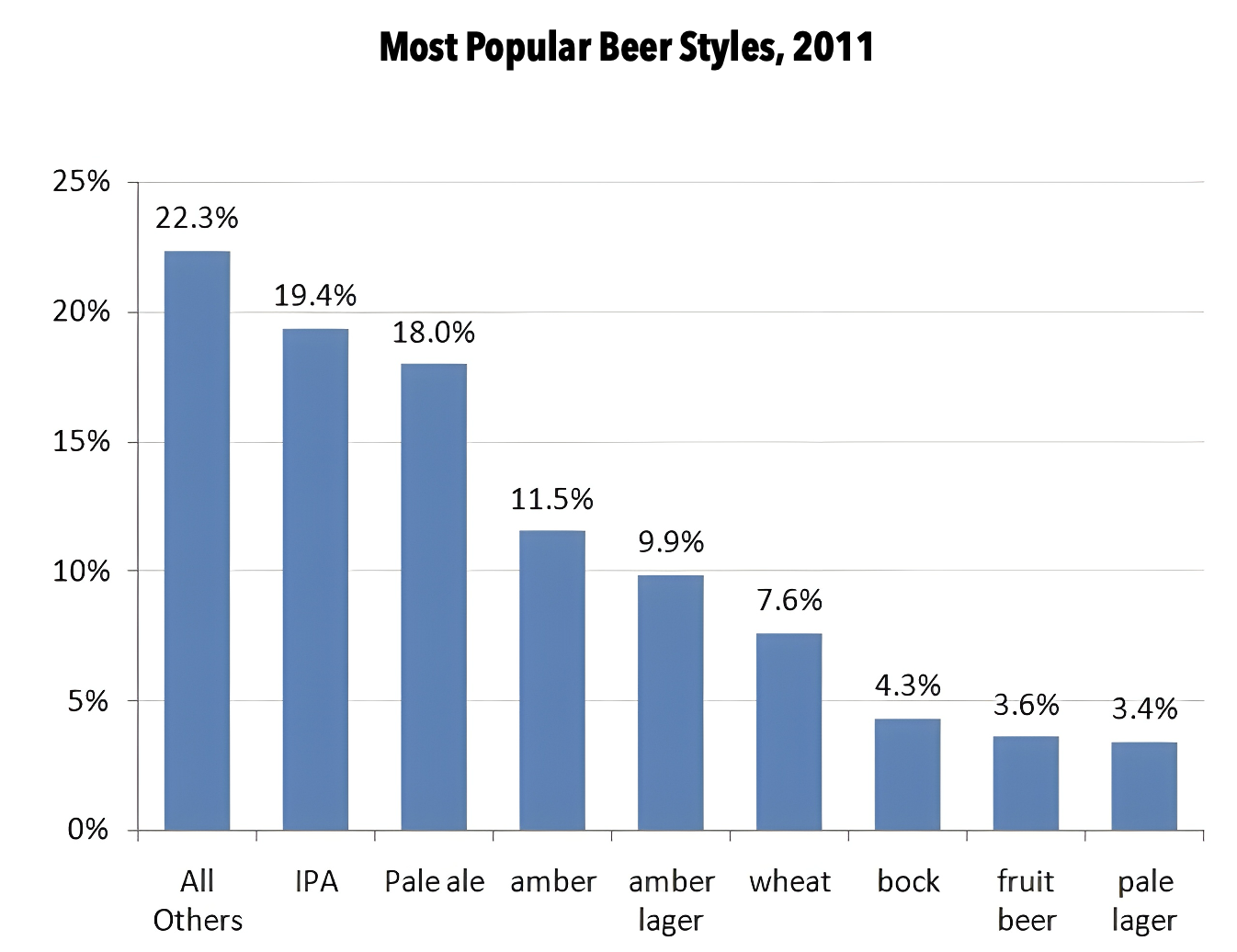 The final two items are a joined pair, and they are historic from a global beer perspective. From the first few breweries founded int the late 1970s through 2010, craft was a small segment of the beer industry dominated by mild styles of beer like wheat ales, pales ales, and amber lagers. IPAs were already rocking by the aughts in the Pacific Northwest, but that was a regional preference. Then the Hop Breeding Company released a new cultivar it called “Citra” and the course of craft brewing went toward hops in every corner of the country. Citra was the first of the modern type of American hop that was rich in fruit scents and flavors, and brewers immediately responded by making beer to take advantage of these qualities. Citra and the new-wave American hops allowed for a new kind of ale built around intense aromatics and flavor rather than bitterness, which appealed to a broad audience (see entry number 7). By 2011, the most popular craft style was IPA, and it would continue to grow every year after.