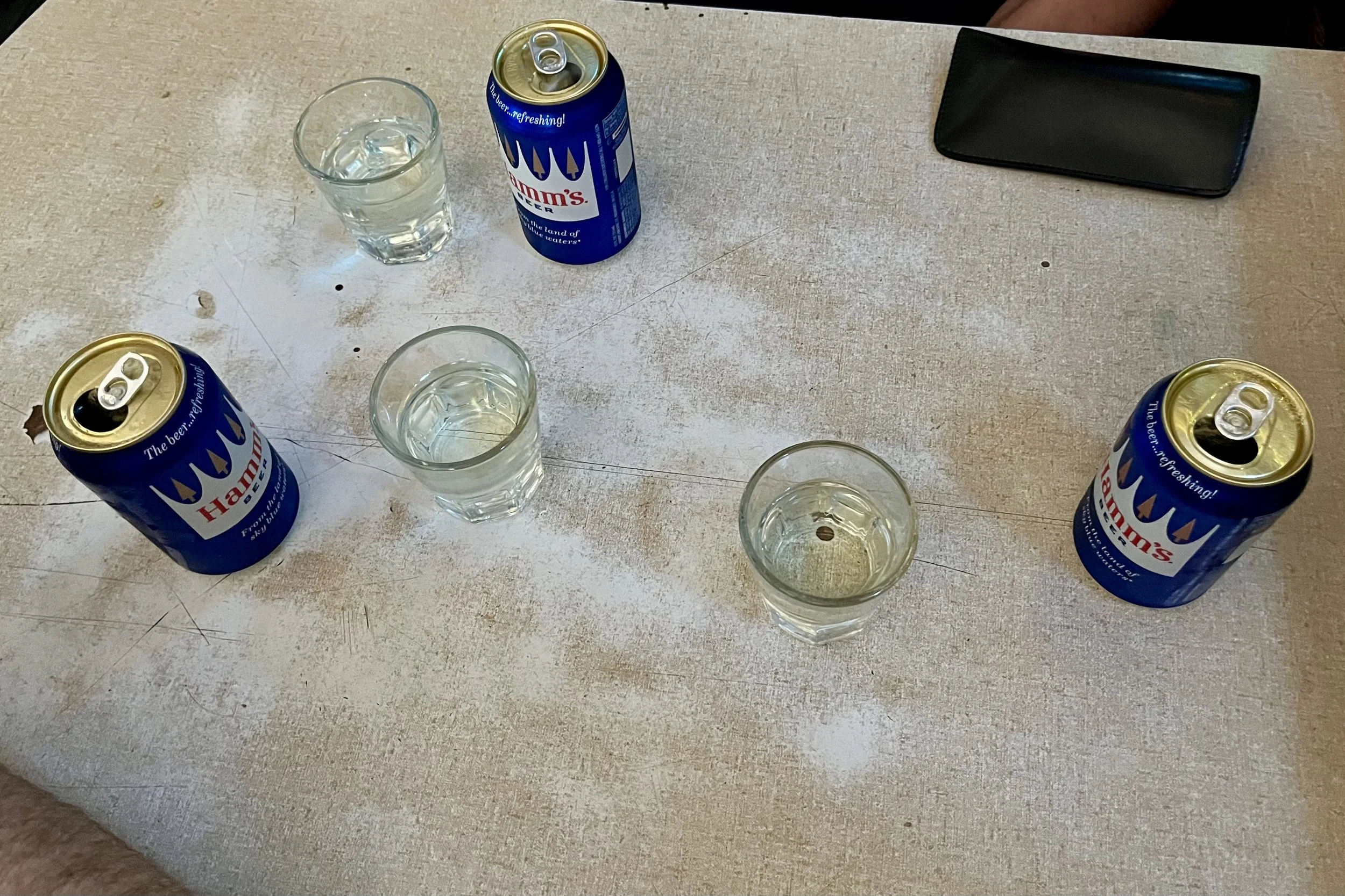 Franks is a little snooty, Mark was reminded. If you order a citywide there, they correct you: “It’s a Franks’ Special,” the bartender will say, before handing you a citywide. In the event, it’s a can of Hamm’s and something water-clear that smells of grain alcohol. (Which turned out to be a kamikaze.) Mark ordered one each for the three of us to sample on our little ethnographic exploration. Tab: $12. For all three.