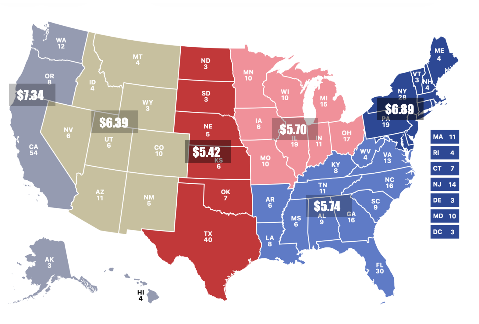 Beyond states, regions are also quite variable as well. Below is a map of the regions and the average beer prices in each. (I wouldn’t focus overmuch on the regional arrangements—shifting some states to other regions or breaking the country up into different regions doesn’t change the basic calculus.)